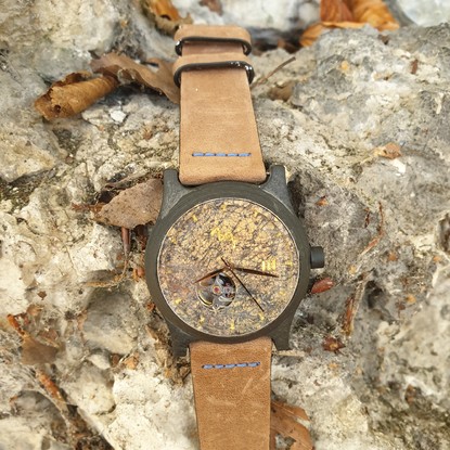 Marmurowa tarcza opakowana w klasyczną kopertę w ciemnym wapiennym kamieniu przykryte szafirowym szkłem. Całość w lekko sportowym charakterze do nadającym się zarówno do codziennego ubrania jak i bardziej eleganckiego.